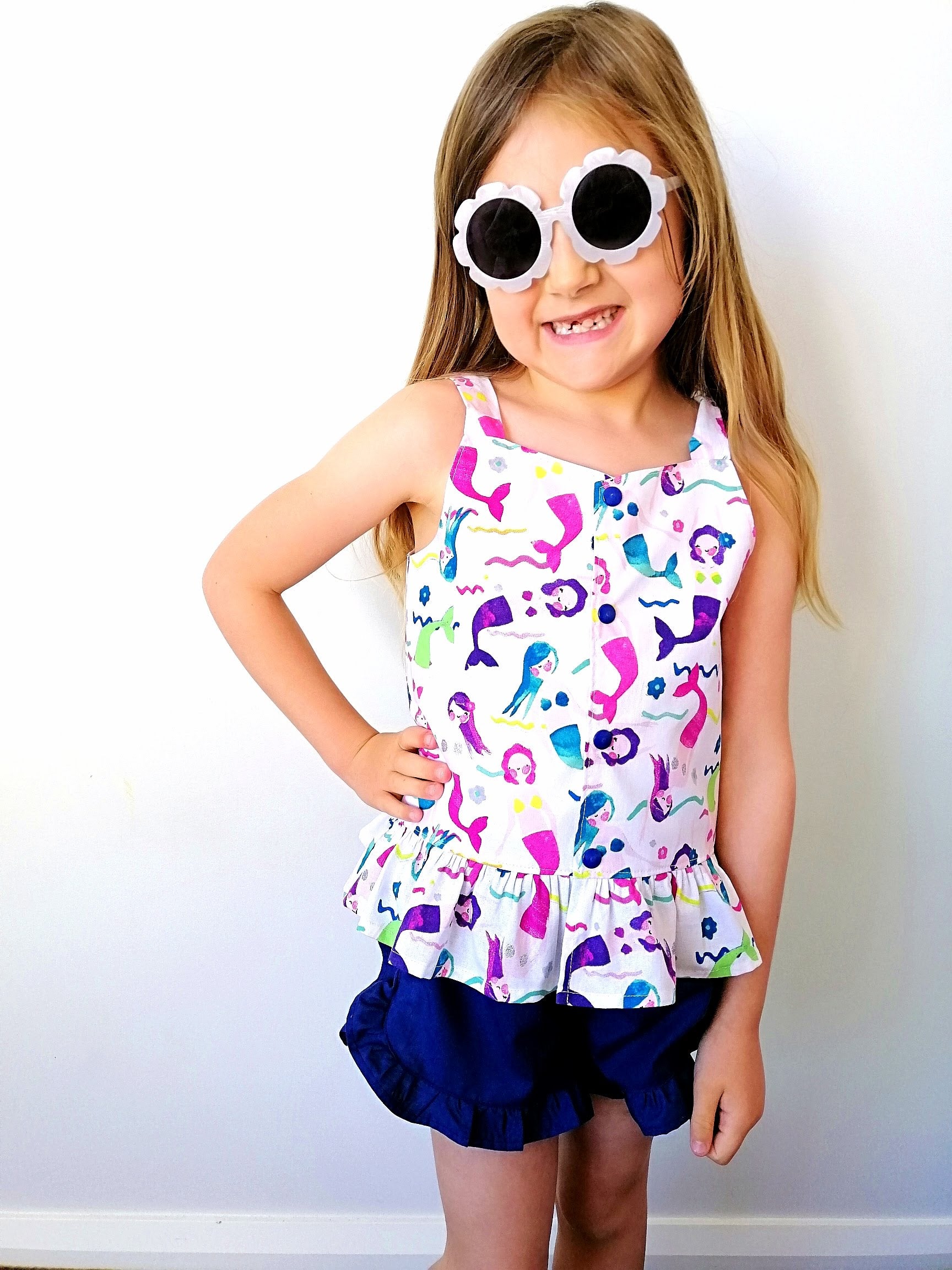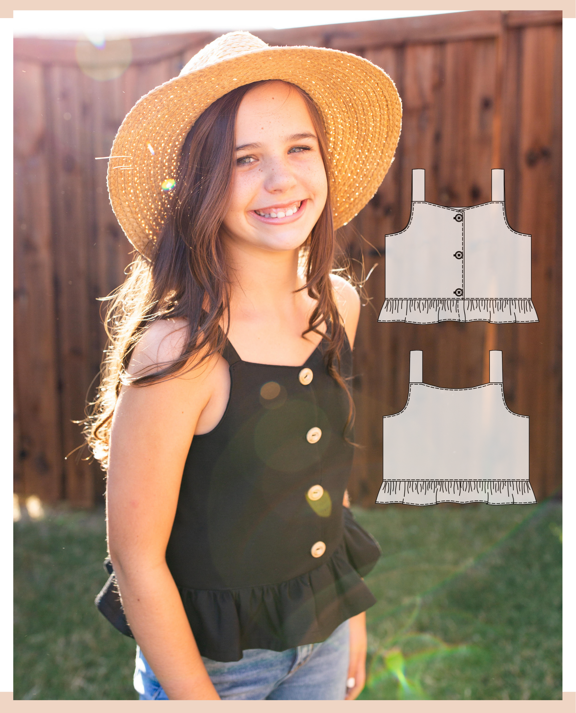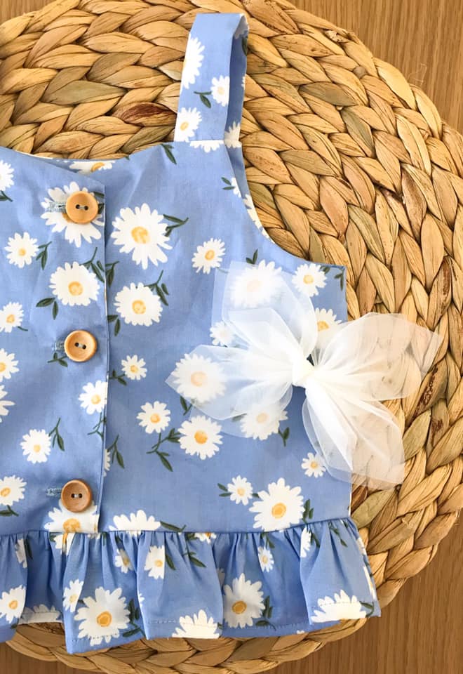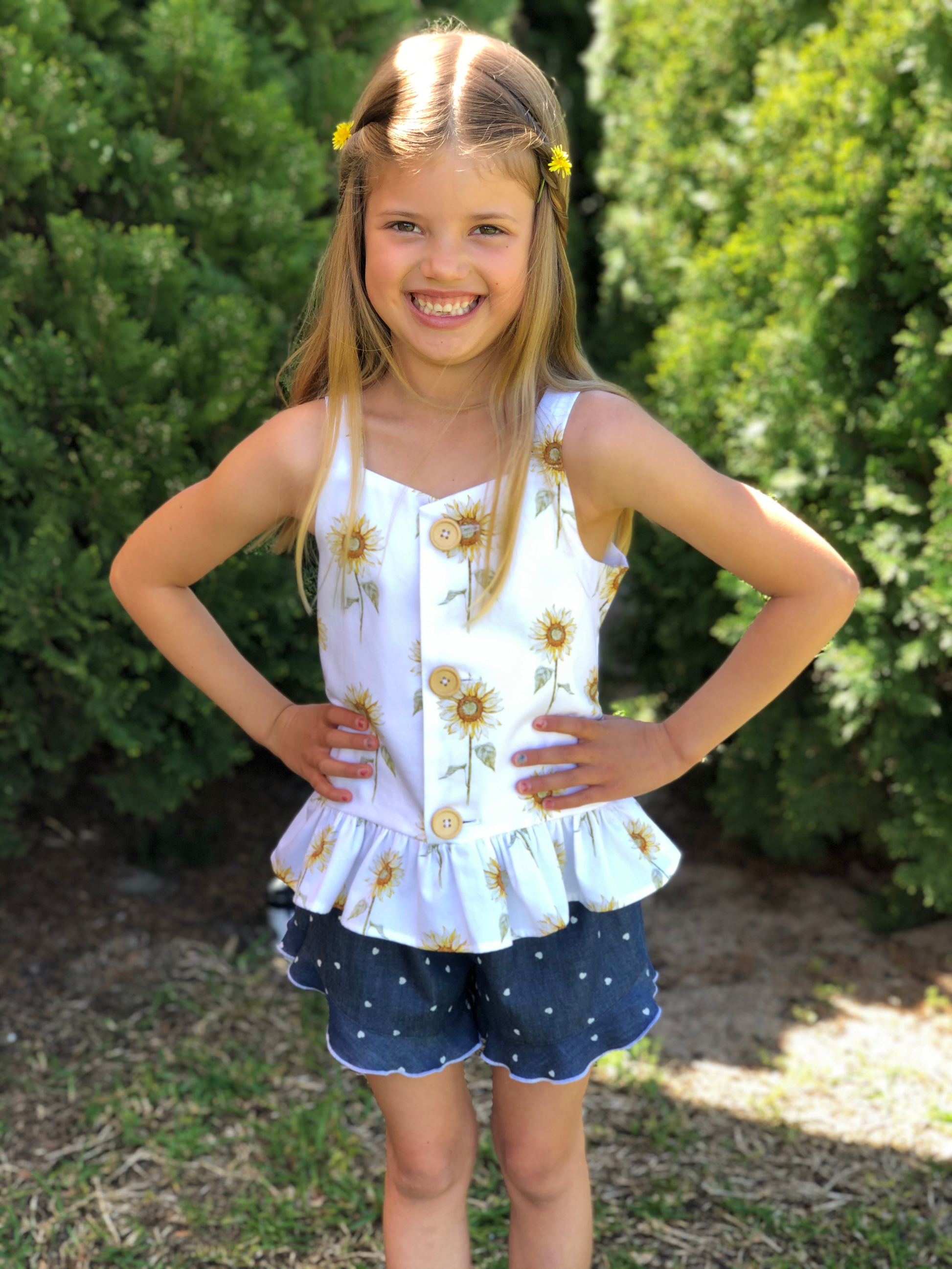 The Arya Top is your new go-to piece for casual, effortless style. With its singlet-style silhouette, charming button-up front, and ruffle hem, Arya is a breeze to wear on warm summer days—or layered under a cozy cardigan for cooler seasons. Whether worn to the playground or paired with jeans for a weekend outing, Arya is a wardrobe staple with a playful twist.