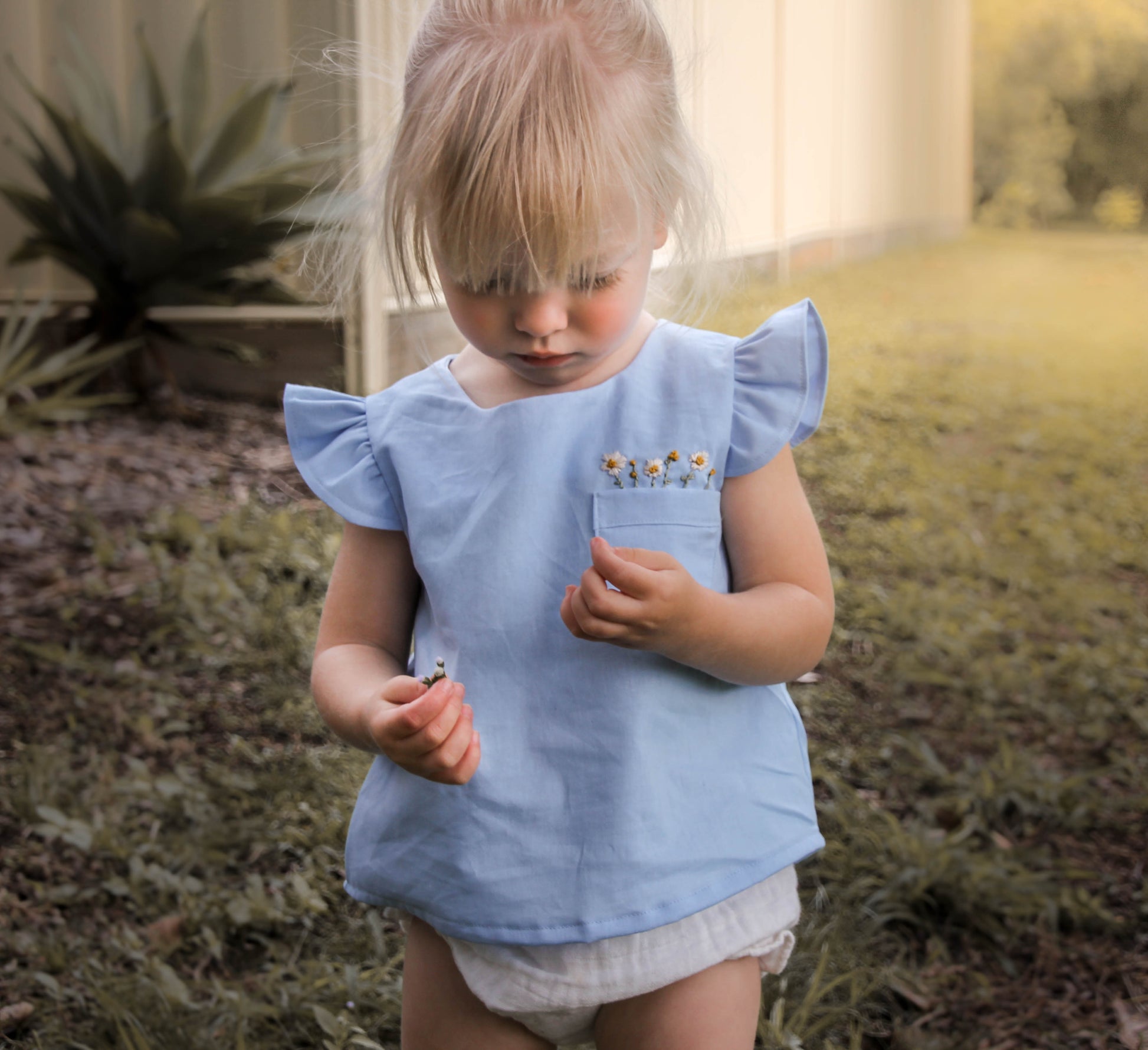 The Millie is a cute and simple top, dress or playsuit perfect for warm sunny days of play. Features a cute tiny pocket, optional collar & a curved hem with a subtle drop back design.