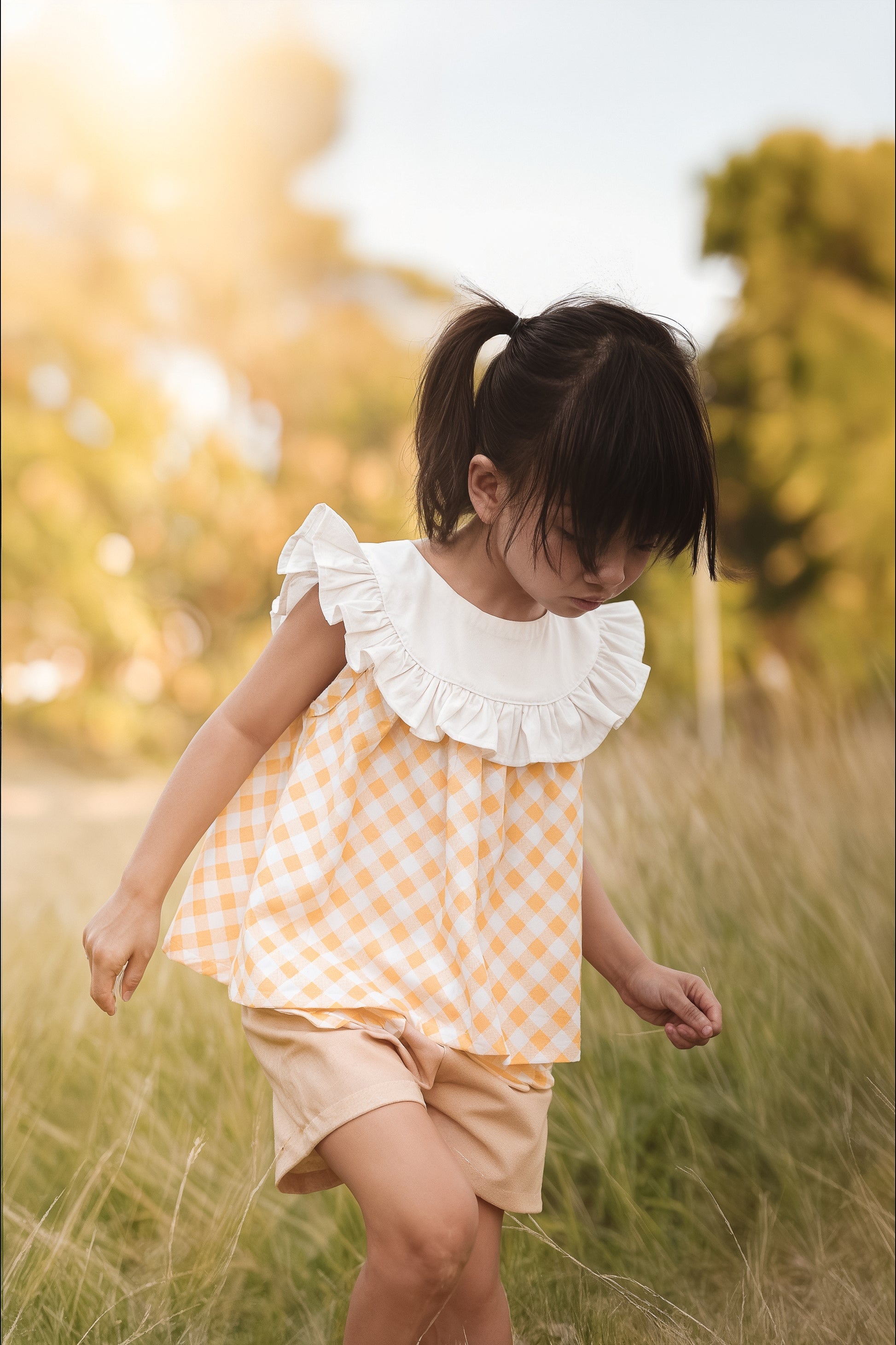 Ruffled Yoke: A rounded yoke with delicate ruffles, inspired by the soft petals of a flower.