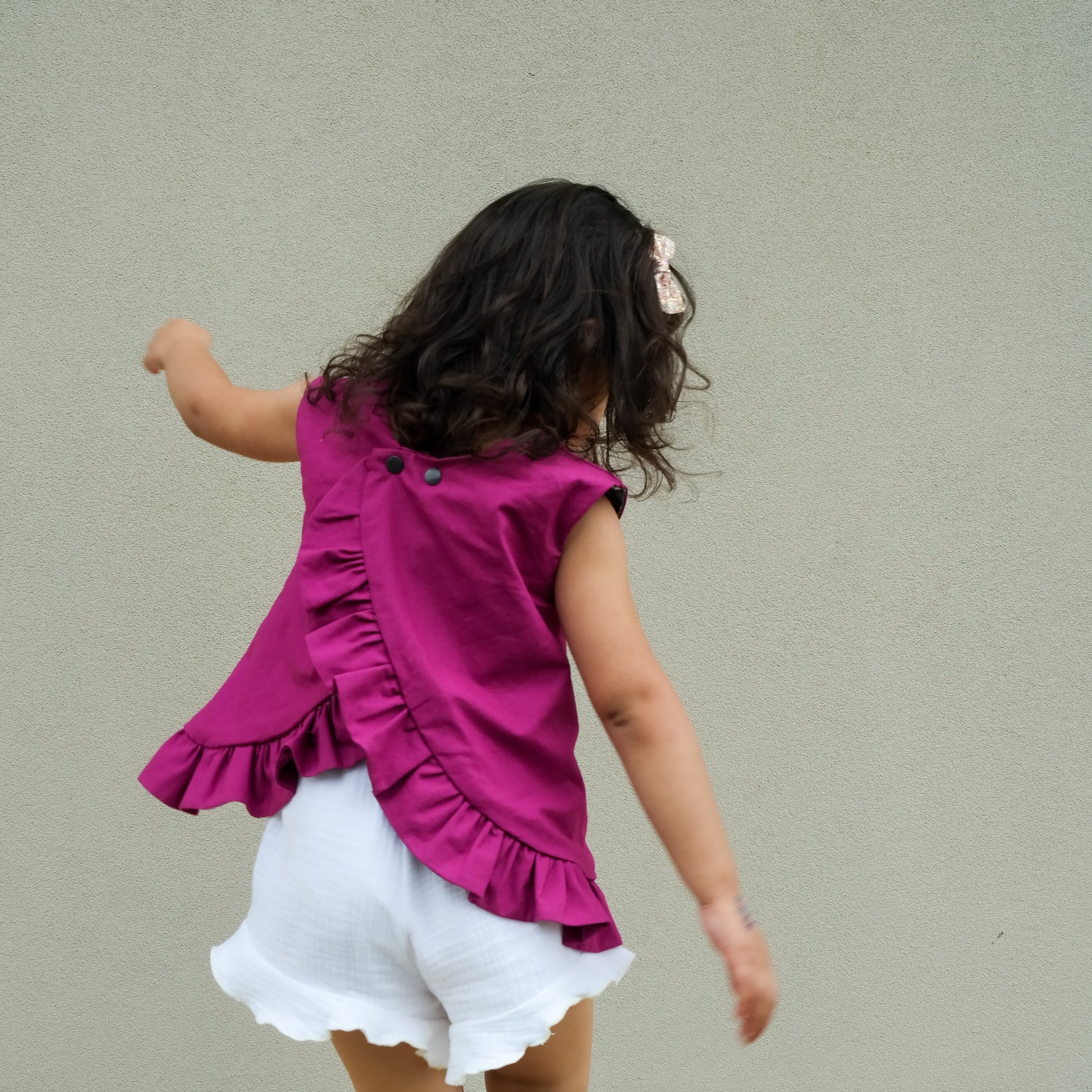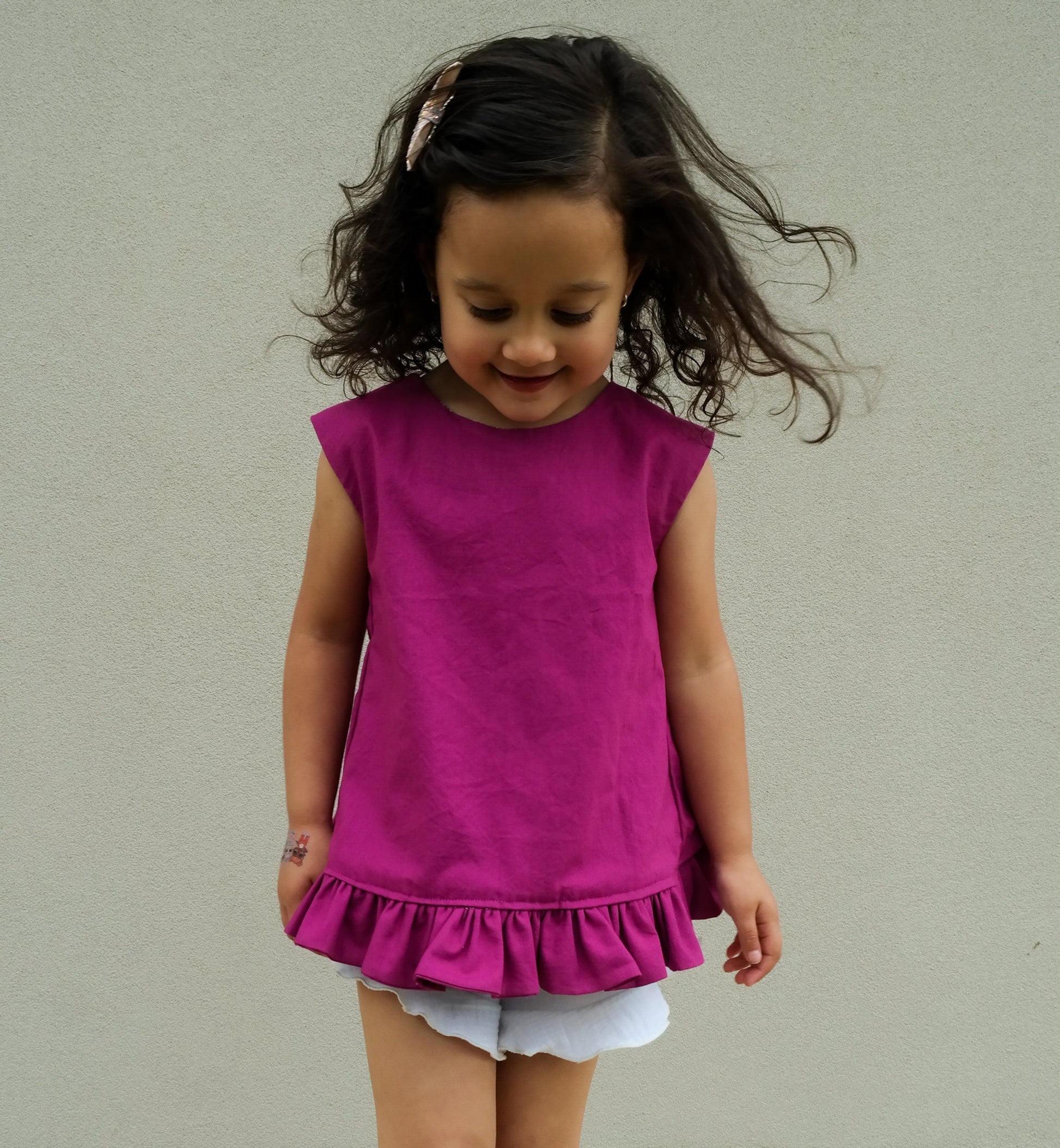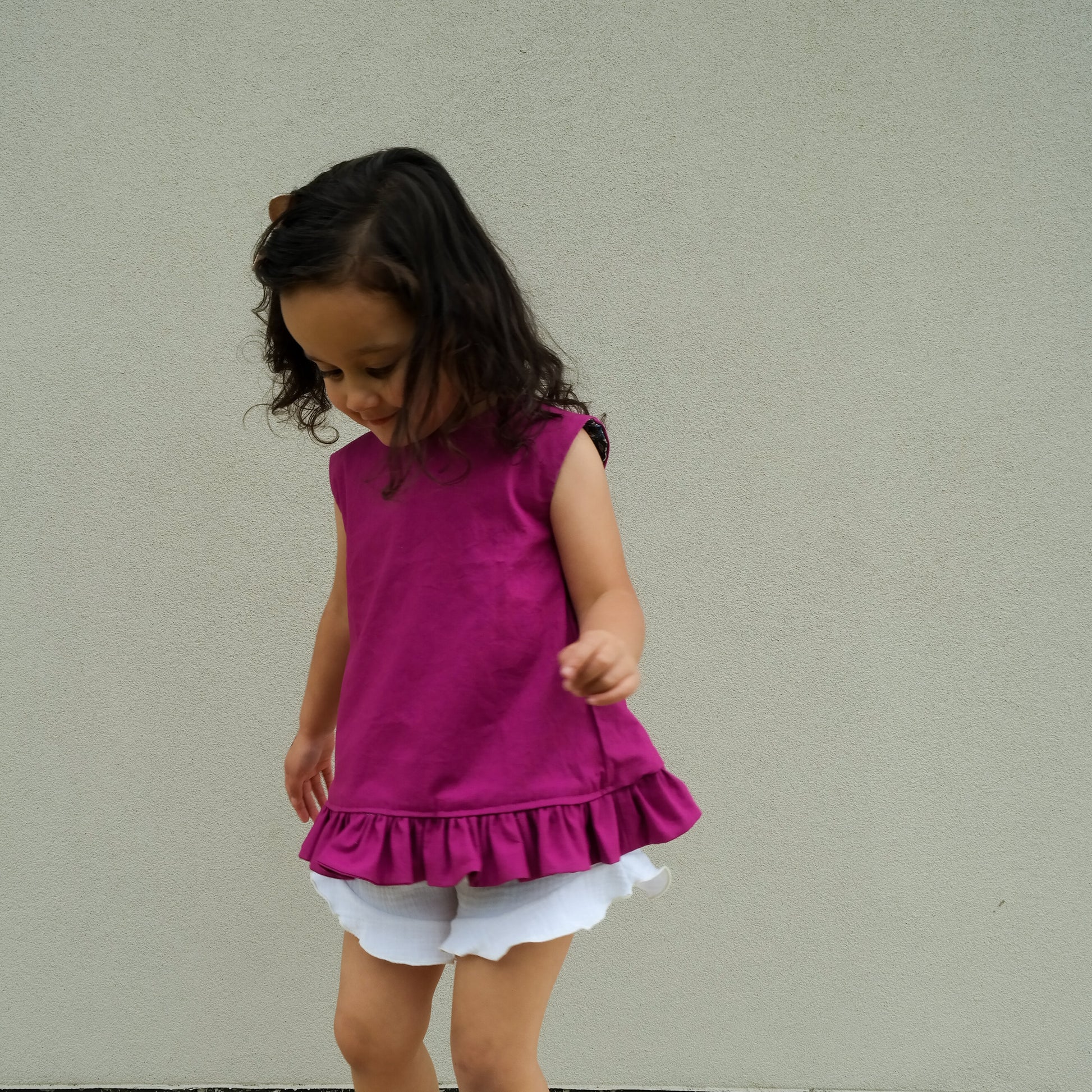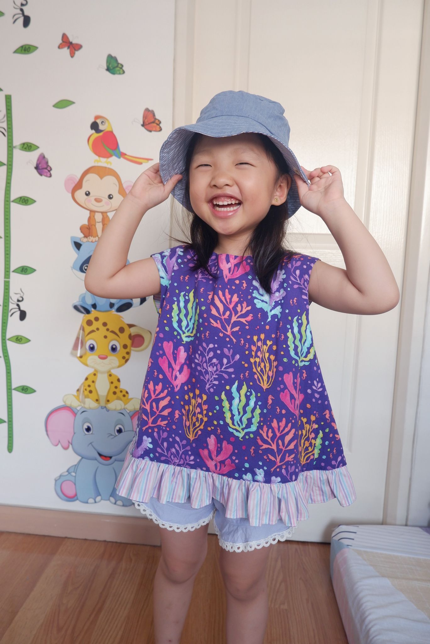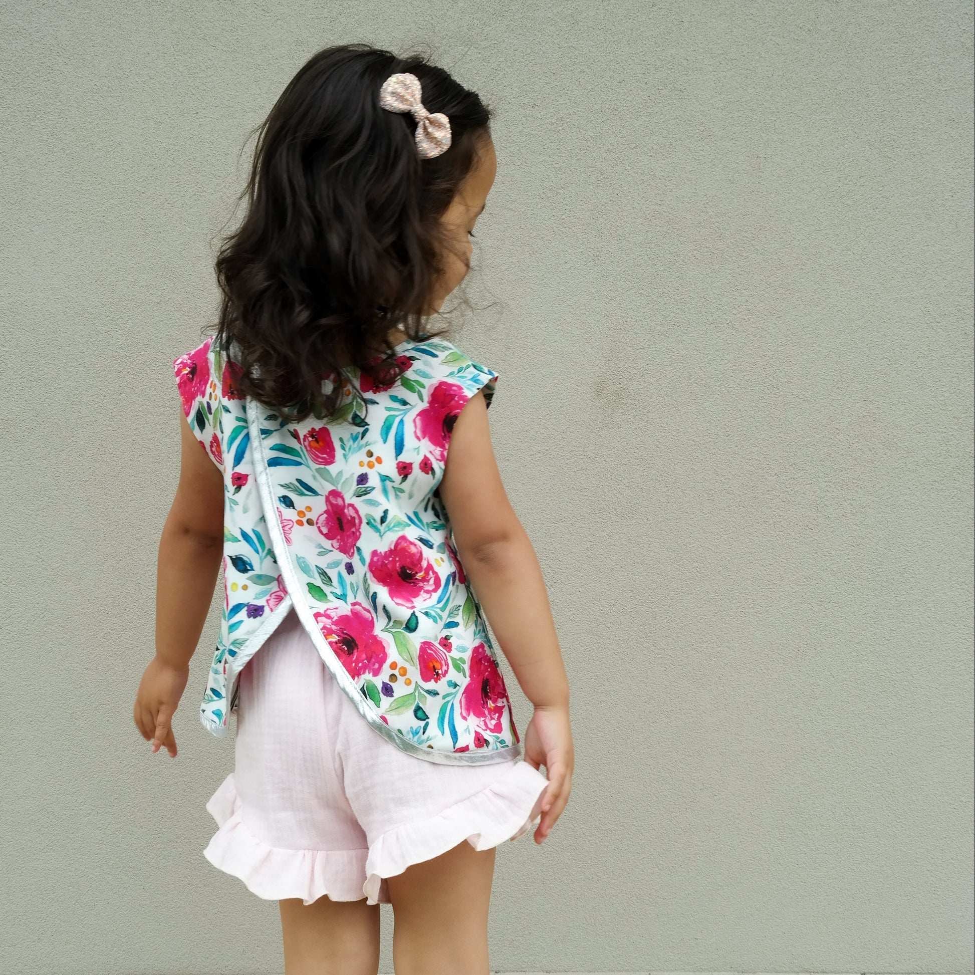 Isla is a cute and fun little swing top. It features a tulip back design and a ruffle-trimmed hem. The cap sleeve offers more protection from the sun, so it’s perfect for everyday play. Oh, and it’s reversible too!