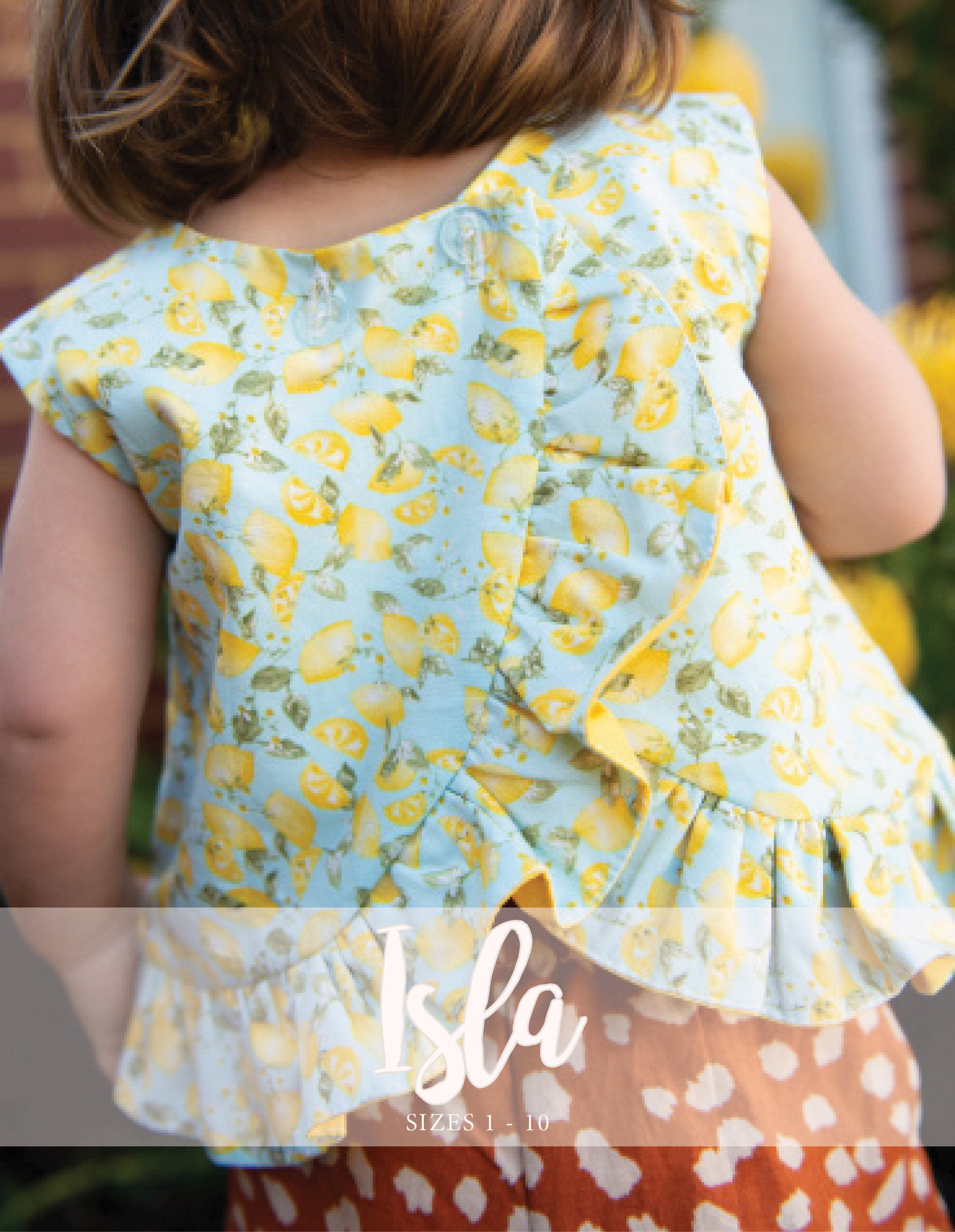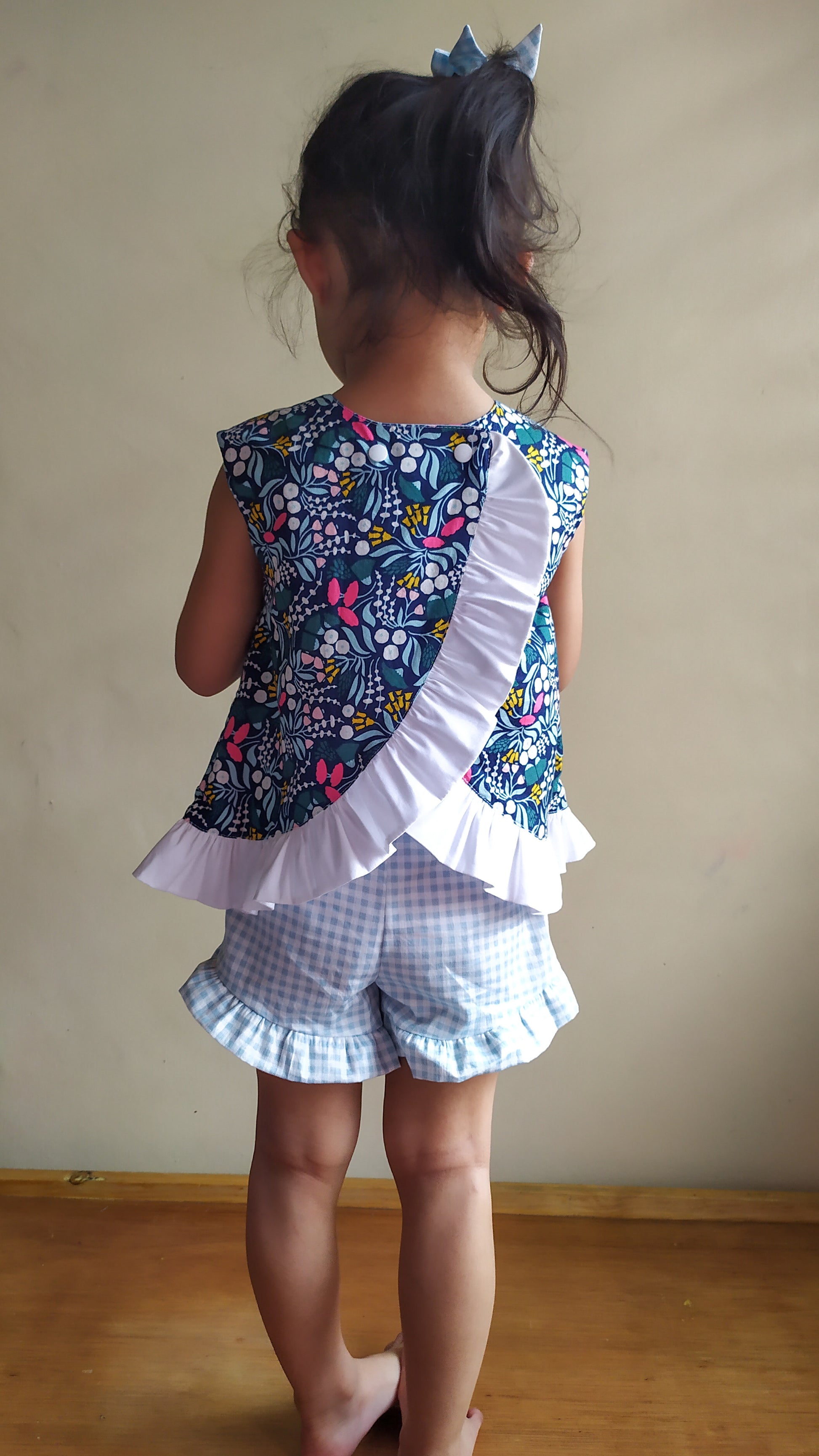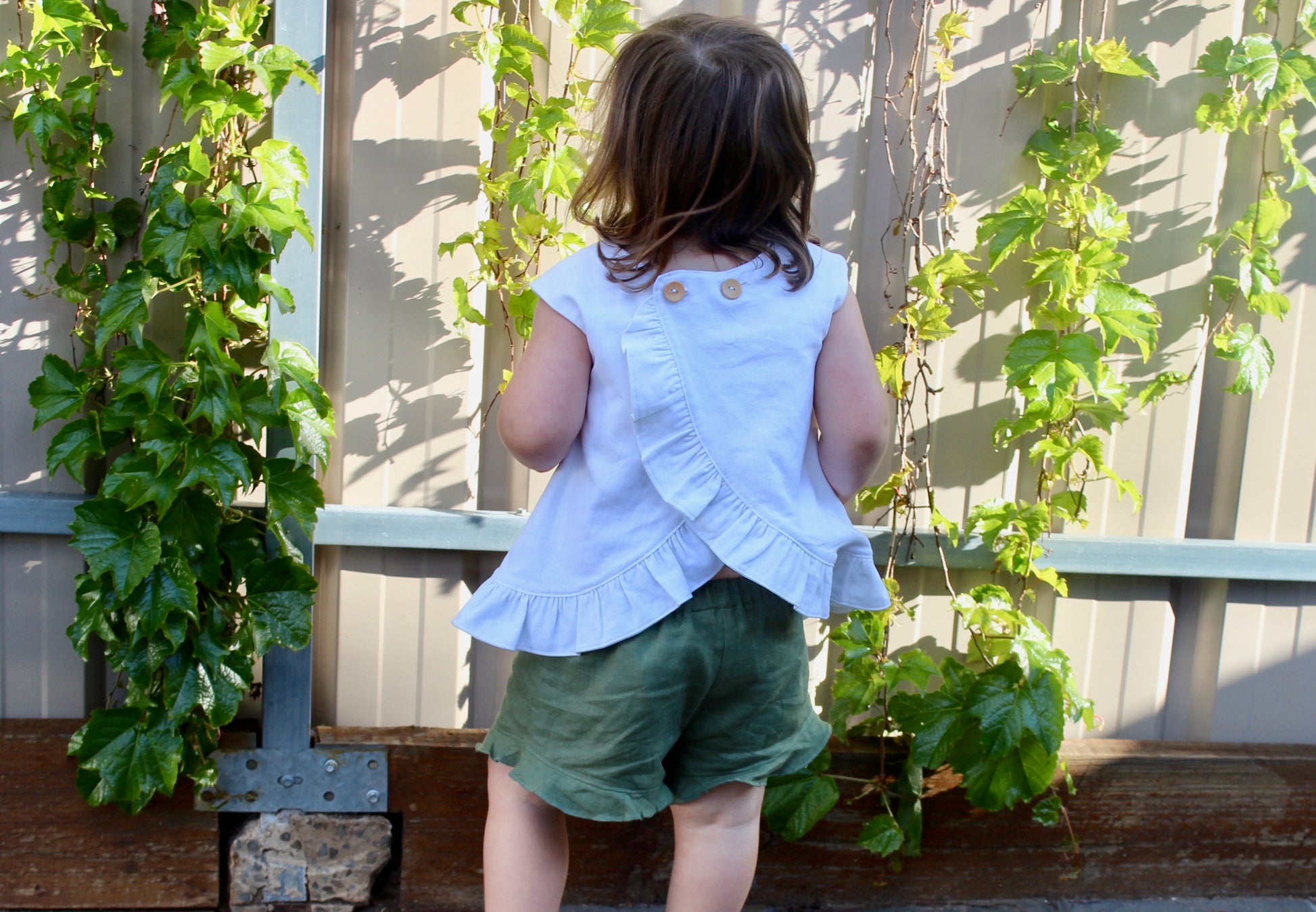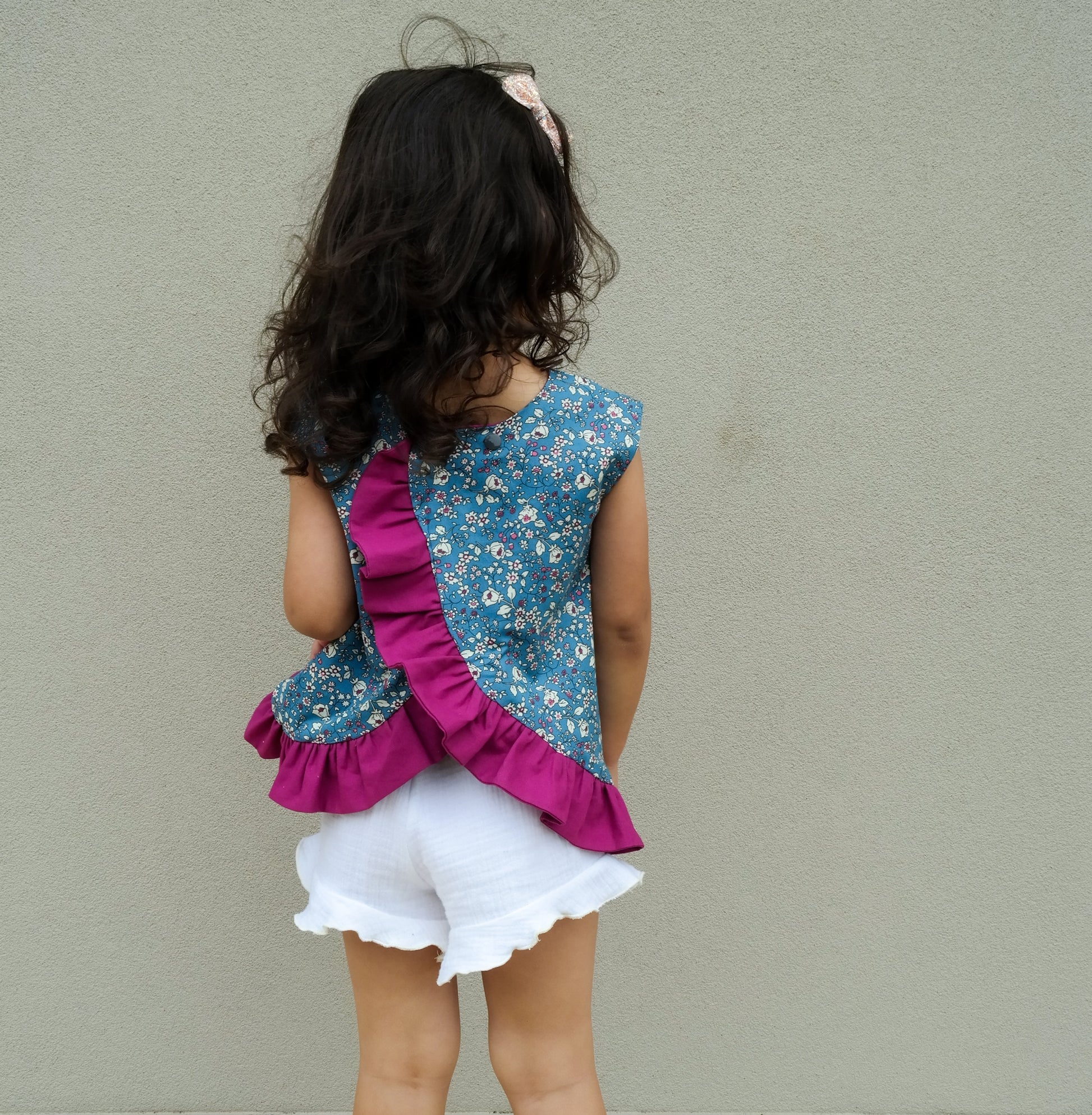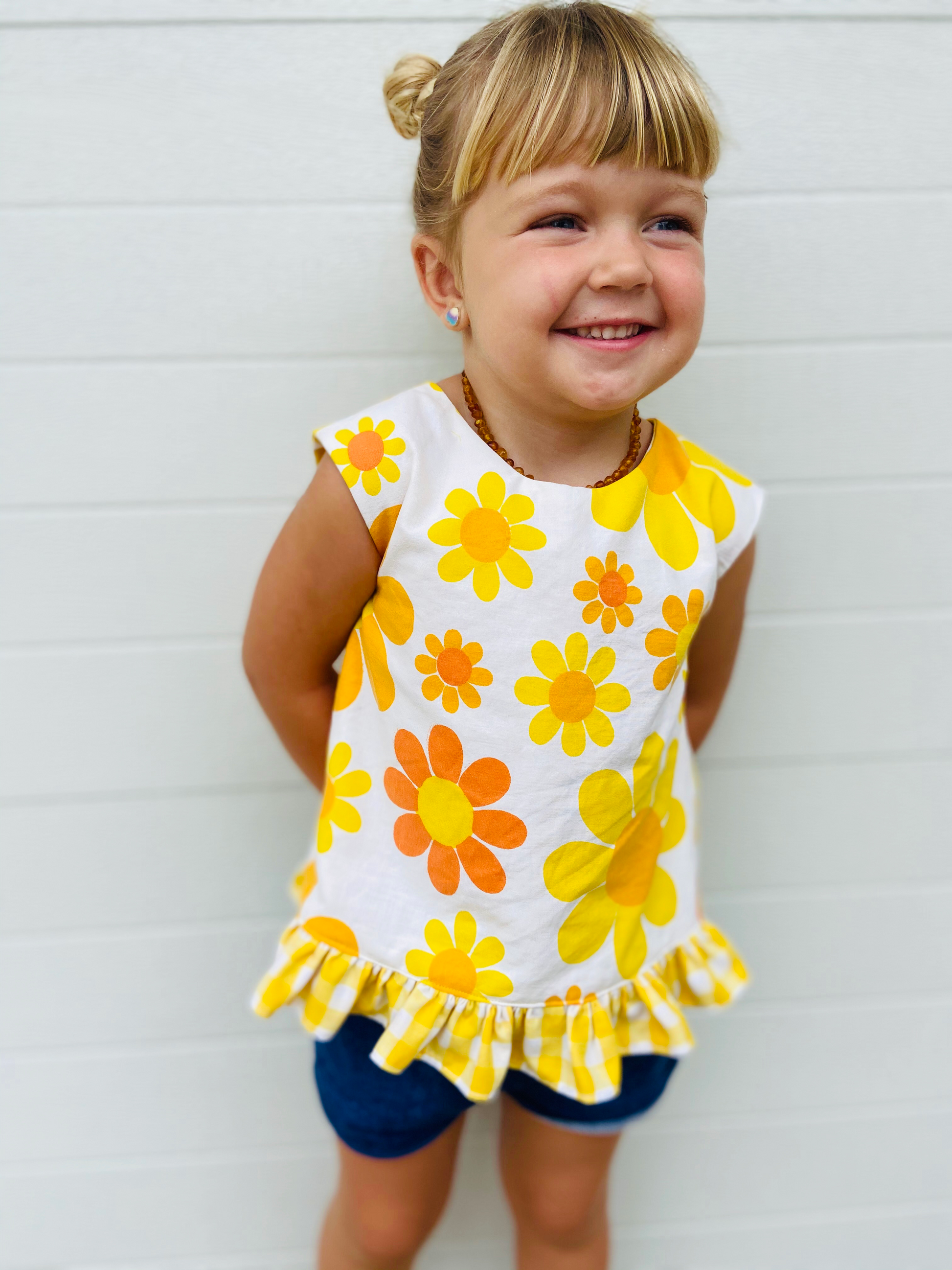 Isla is a cute and fun little swing top. It features a tulip back design and a ruffle-trimmed hem. The cap sleeve offers more protection from the sun, so it’s perfect for everyday play. Oh, and it’s reversible too!