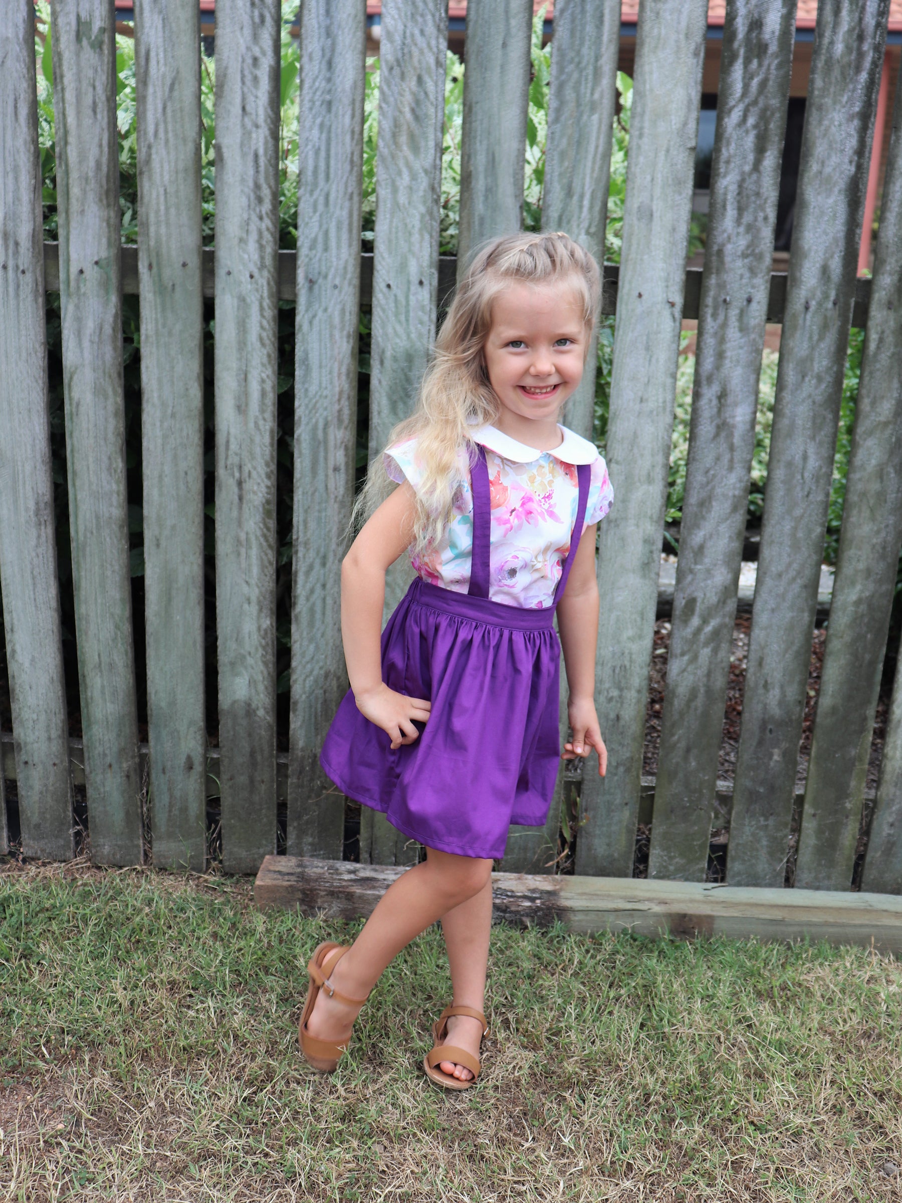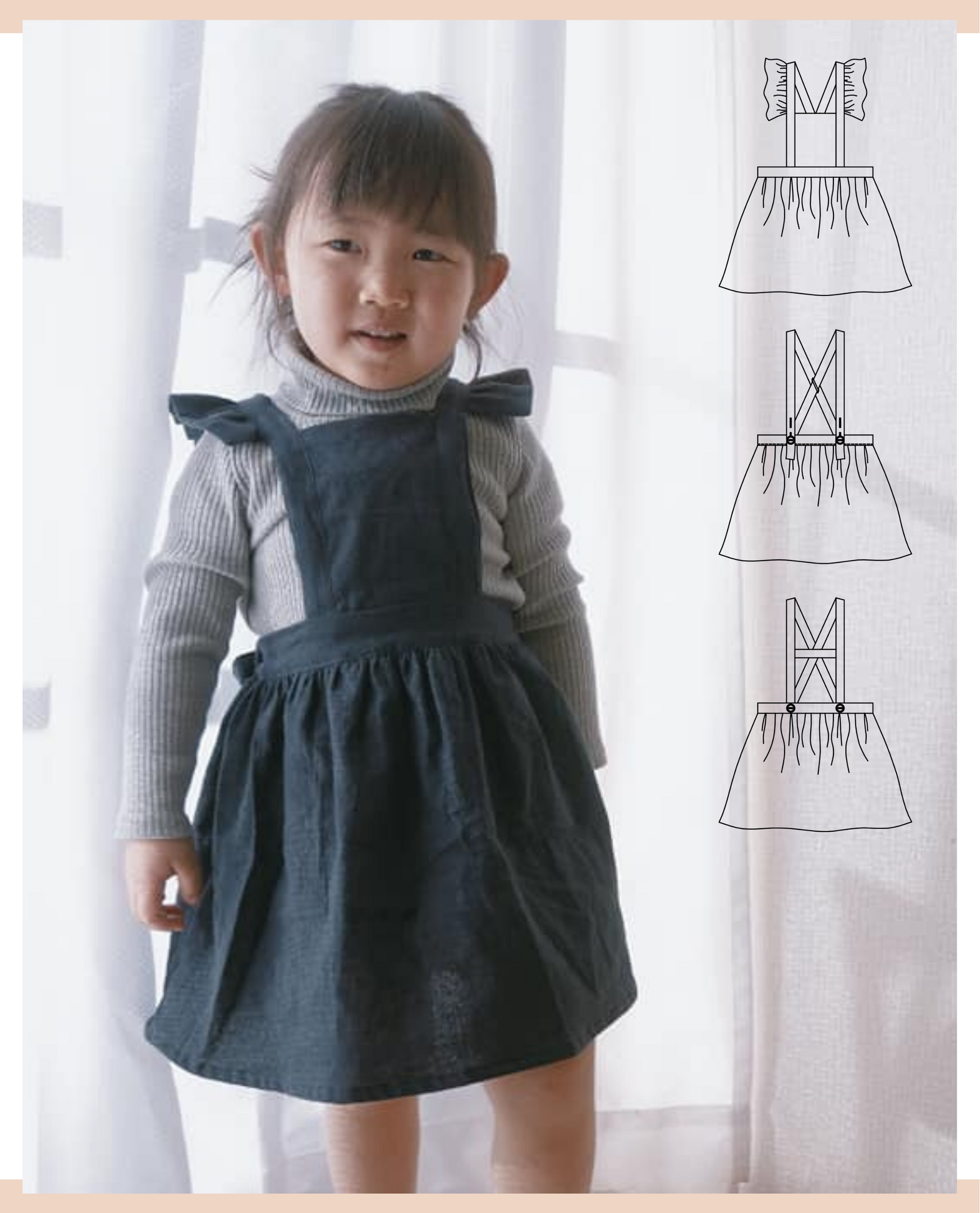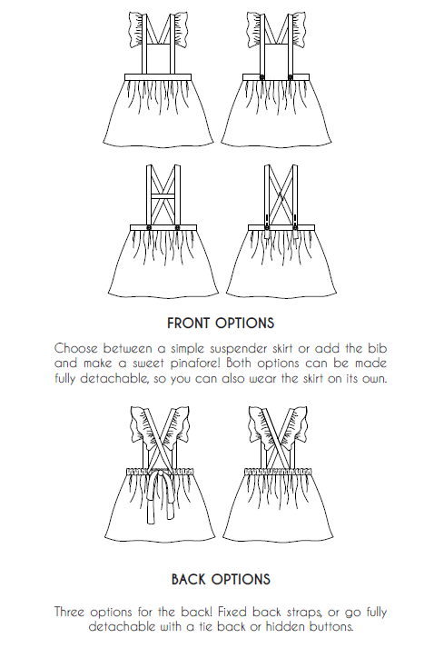 Choose between a simple suspender skirt or add the bib and make a sweet pinafore! Both options can be made fully detachable, so you can also wear the skirt on its own.