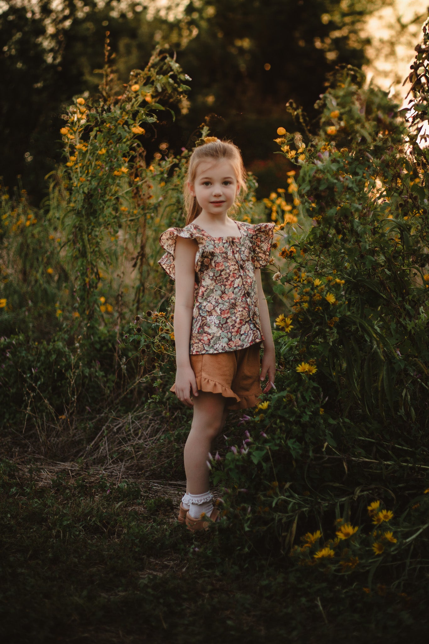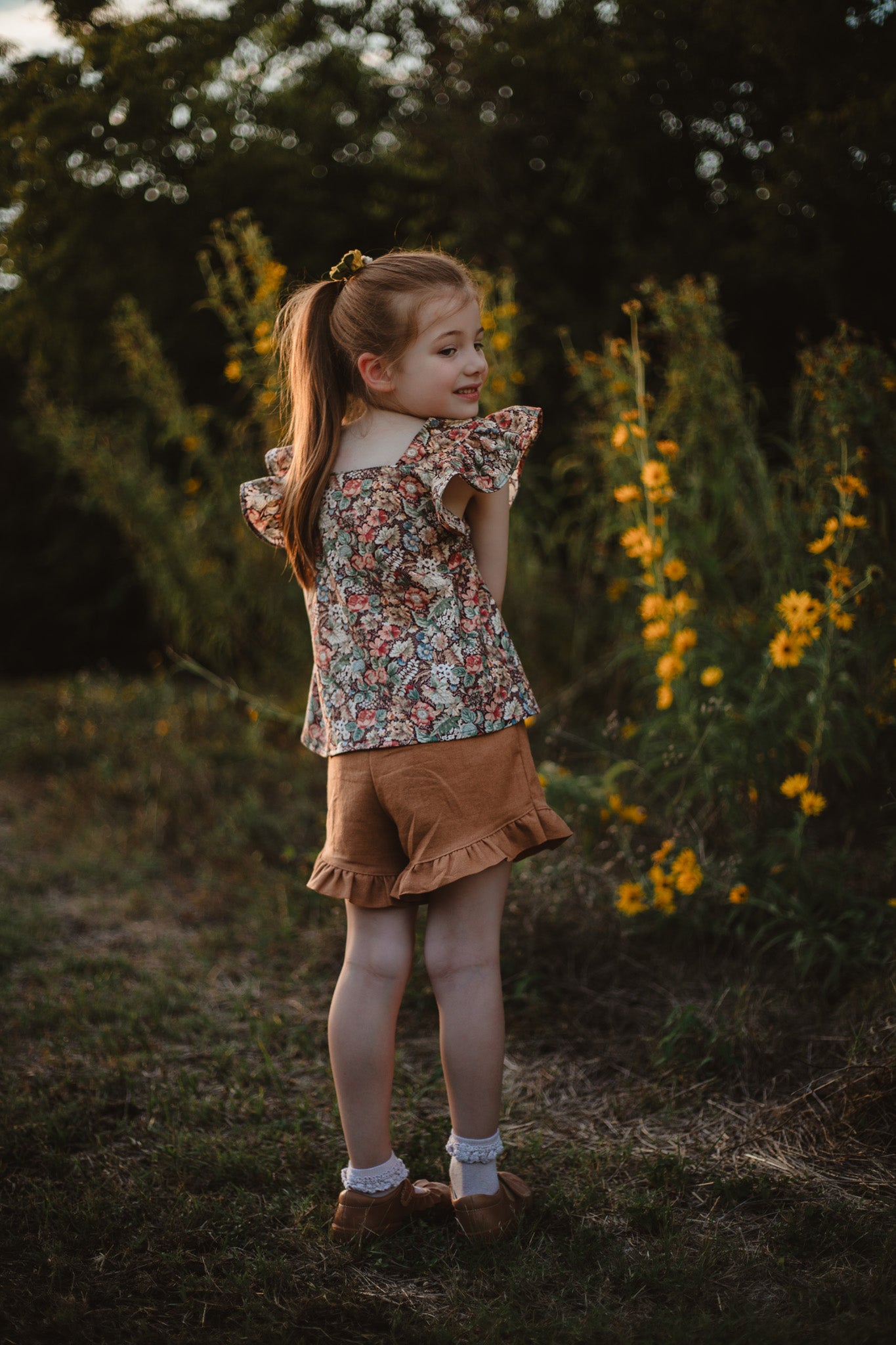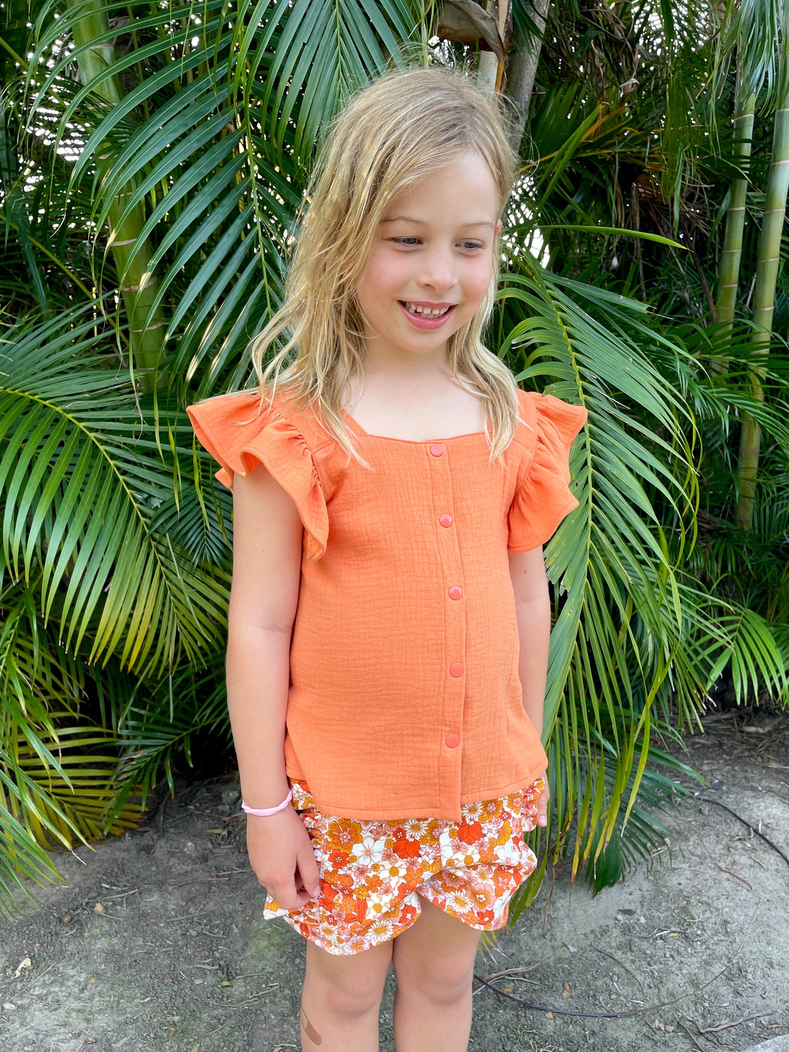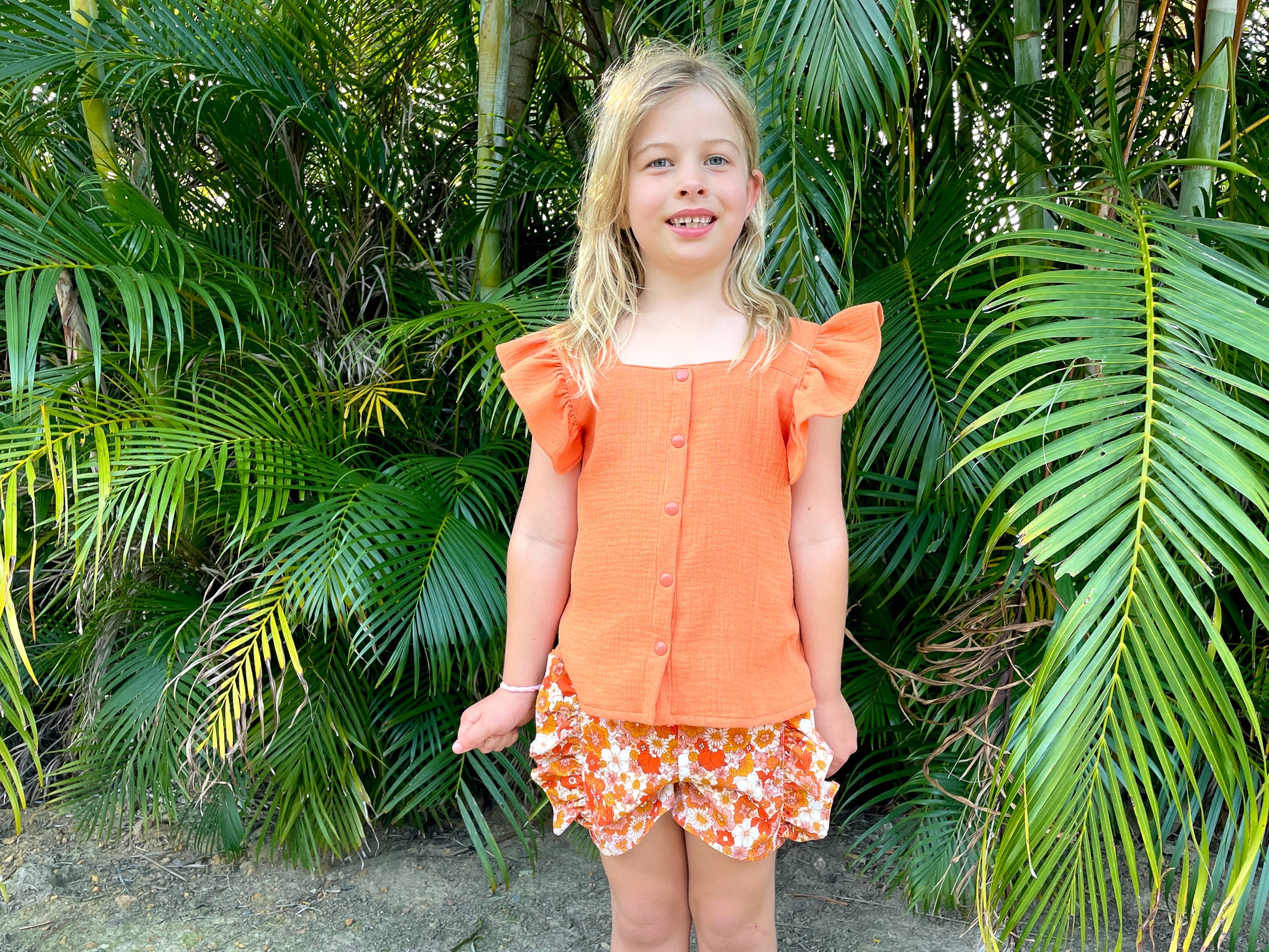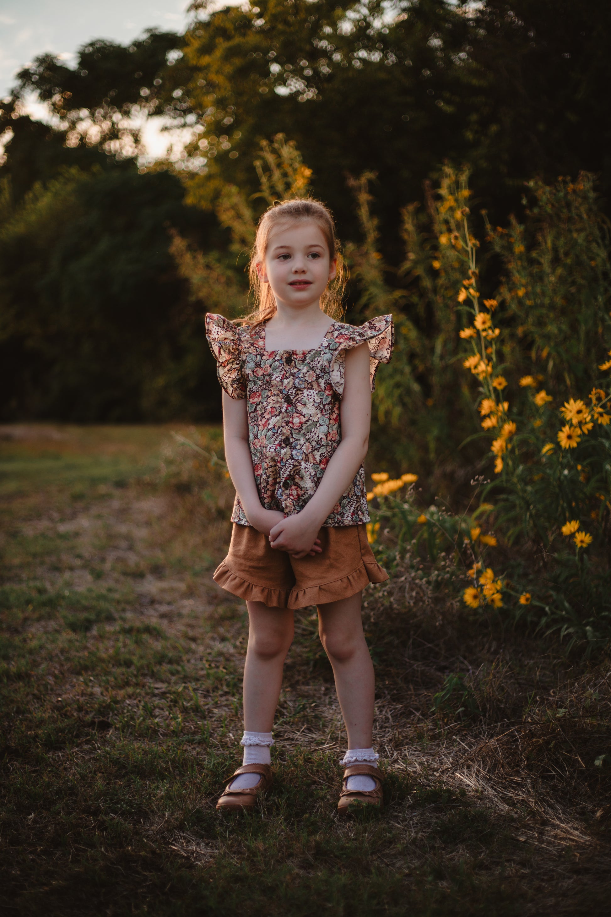 Introducing the Maggie Top—a sweet and simple design featuring adorable ruffle sleeves and a cute button-up front. Perfect for comfort and play, this top is a quick and easy sew that will become a go-to in your little one’s wardrobe!