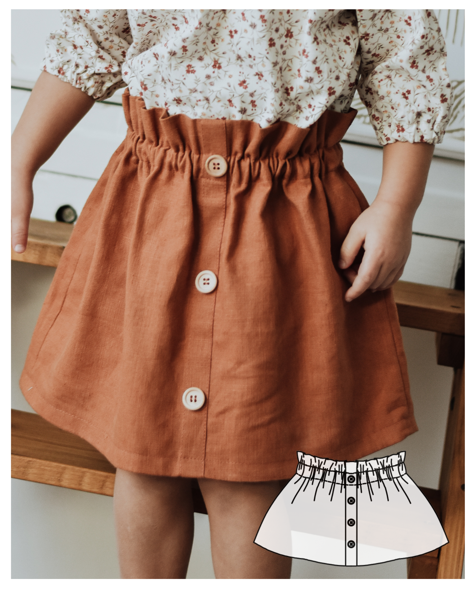 Remi is a sweet and simple skirt featuring a paper bag waist and faux placket. It's such a classic style you and your little girl will love!